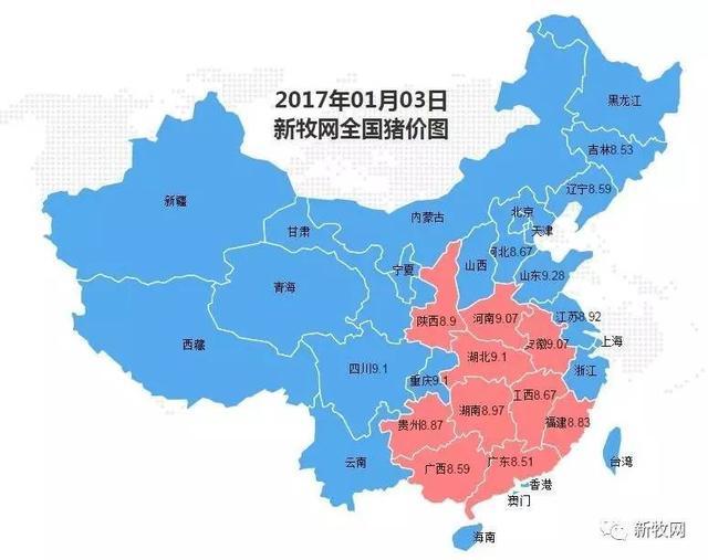 据监测统计,1月3日全国猪价指数报144.79点,生猪均价8.92元/斤。2017元旦期间,全国共计23个省区猪价上涨。受市场需求增加提振,猪价上涨幅度加大,生猪均价直逼9元/斤,全国有13个省区猪价涨至9元/斤以上。