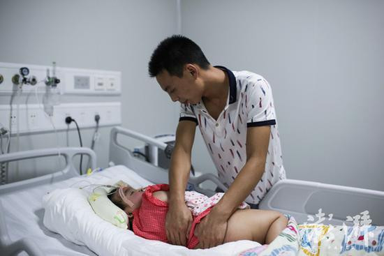 2016年8月11日,在ICU病房里,两岁零八个月的小辛怡身上布满插管,她看上去“胖乎乎”的。然而这并非是父母“养得好”,而是因为昏迷长期卧床所致。日夜守候在病床旁的父亲张少峰一边按摩一边呼唤她的名字,有时她也会伸伸小手。