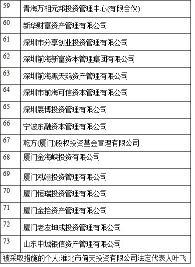 证监会8月19日通报2016年上半年私募基金专项检查执法情况,共有73家私募机构被采取行政监管措施,其中包括红杉资本股权投资管理(天津)有限公司、福建滚雪球投资管理有限公司、广州市创势翔投资有限公司等知名私募机构。淮北市倚天投资有限公司法定代表人叶飞,是唯一被被采取措施的个人。