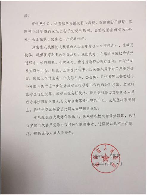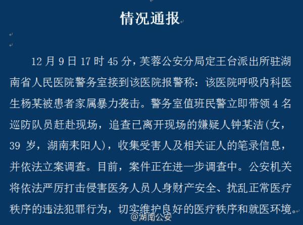 另据湖南省公安厅官方微博@湖南公安 13日上午10点左右发布通报称:12月9日17时45分,芙蓉公安分局定王台派出所驻湖南省人民医院警务室接到该医院报警称:该医院呼吸内科医生杨某被患者家属暴力袭击。警务室值班民警立即带领4名巡防队员赶赴现场,追查已离开现场的嫌疑人钟某洁(女,39岁,湖南耒阳人),收集受害人及相关证人的笔录信息,并依法立案调查。