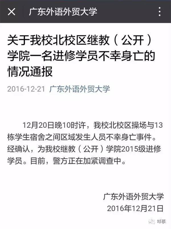 广东外语外贸大学21日凌晨发布通报称,12月20日晚10时许,我校北校区操场与13栋学生宿舍之间区域发生人员不幸身亡事件。经确认,为我校继教(公开)学院2015级进修学员。目前,警方正在加紧调查中。