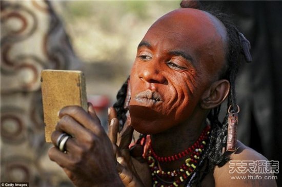 一名男子正在专心致志地画眼线。沃达贝人有自己的审美标准,通常高挑的身材、明亮的眼睛、洁白的牙齿和一个高挺的鼻子会是一个男人的加分项,为了达到这些,他们特意在头上佩戴鸵鸟羽毛增加高度、在脸上涂满厚厚的红粘土、描上又粗又黑的眼线用以突显自己明亮的眼睛、甚至还会涂唇膏炫耀洁白的牙齿。