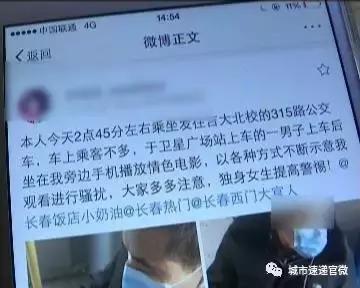 核心提示:这条微博是4号发布的,记者电话联系上了发布者小张,她表示,自己是名大学生,当天下午她乘坐315路公交车,从吉大北校到桂林路。在卫星广场站上来一名男子,男子上车后,坐在了紧邻她身边的座位。